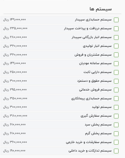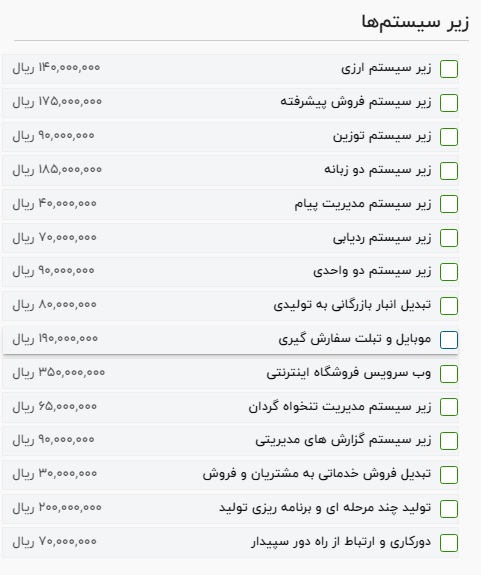 - زیرسیستمهای انتخابی: اضافه کردن ماژولهای تخصصی باعث افزایش قیمت میشود.