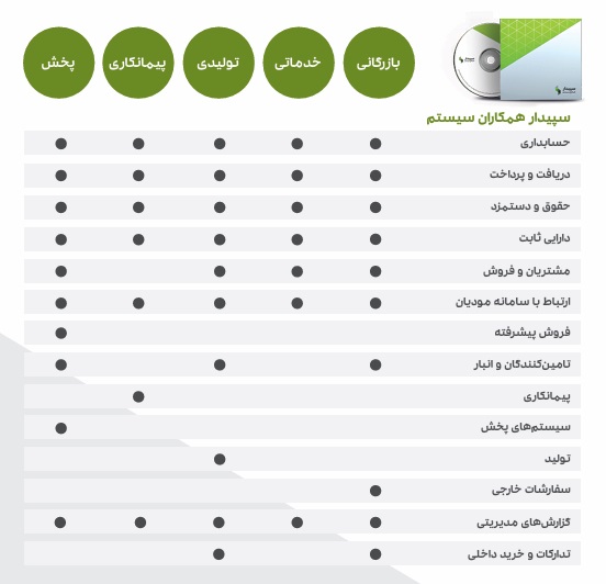 سپید سیستم تهران نمایندگی رسمی فروش سپیدار و دشت همکاران سیستم است و خدمات زیر را ارائه میدهد: